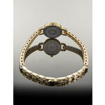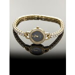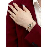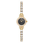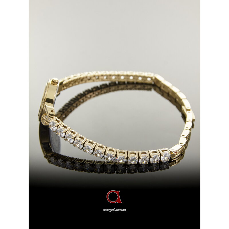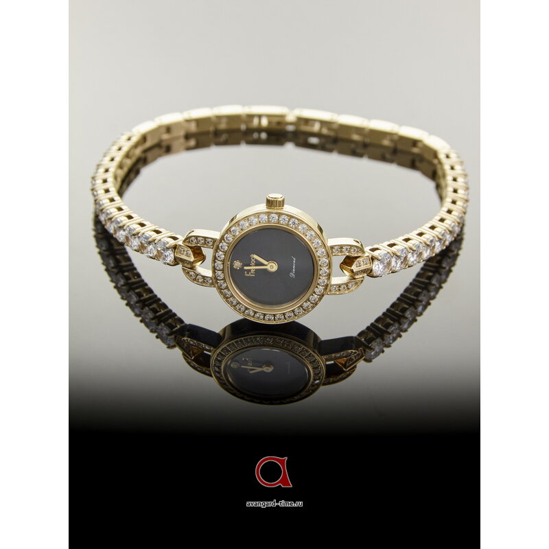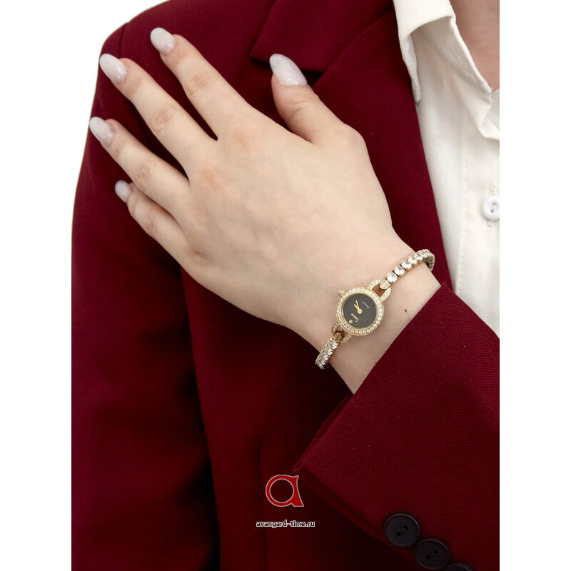 Циферблат с черным фоном не содержит отметок, что создаёт впечатление утончённой простоты и элегантности. Украшение в виде страз добавляет изысканности и блеска, что делает эти часы идеальным выбором для любой ситуации — от деловой встречи до вечернего выхода.