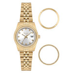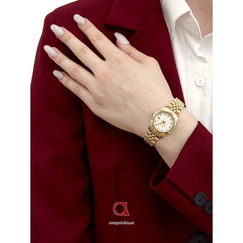Часы Freelook 4.10014-3 имеют аналоговый способ отображения времени, что добавляет классический шарм. Их изысканный круглый корпус выполнен из нержавеющей стали с золотистым покрытием, которое сверкает на солнце и привлекает взгляды. Серебристый циферблат с индикацией в виде отметок и декорированными стразами добавляет нотки блеска, а также прекрасно контрастирует с общим золотистым цветом.