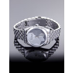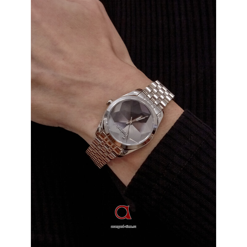 Отличительной чертой модели является аналоговый способ отображения времени, что придаёт часам классический вид, прекрасно сочетающийся с любой одеждой. Комфортный круглый корпус из нержавеющей стали в хромовом цвете дополняет их изысканный внешний вид. Серебристый циферблат, выполненный без отметок, придает часам лаконичность и современность.