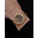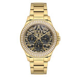 Круглая форма корпуса, выполненного из нержавеющей стали, в золотистом цвете придаёт образу изысканность и роскошь. Черный циферблат с яркими отметками и сверкающими стразами создает эффектный контраст, который не оставит вас незамеченной в любой обстановке. Кварцевый механизм с моделью EPSON VX3JE1 гарантирует точность времени и надежность.