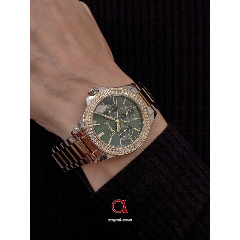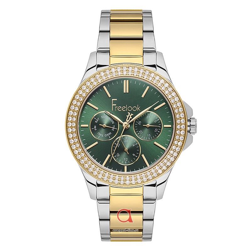 Зеленый циферблат с индикацией в виде отметок красиво контрастирует с яркими акцентами и нежными стразами, которые не только выполняют декоративную функцию, но и делают ваш аксессуар настоящим произведением искусства. Два дополнительных циферблата и календарь обеспечивают максимальную функциональность, делая часы идеальными для повседневного использования.
