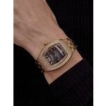 Часы имеют бочкообразную форму корпуса, выполненного из нержавеющей стали с золотистым покрытием, что придает им утонченный и шикарный вид. Темно-сер Convex циферблата подчеркнут стильный комбинированный тип индикации, а детализированные стразы добавляют изюминку и блеск. Способ отображения времени – аналоговый, что позволяет легко считывать время с любой дистанции.