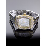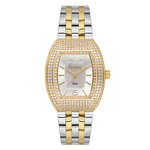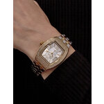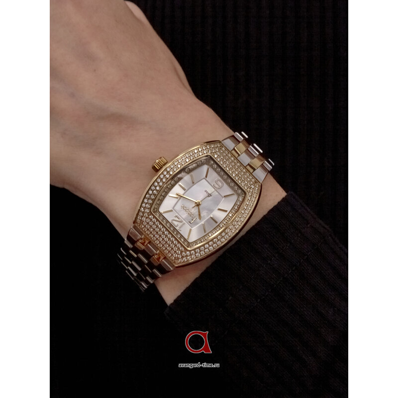 Часы имеют бочкообразную форму, что добавляет им утонченности и индивидуальности. Золотистый корпус из нержавеющей стали гармонично сочетается с хромированным ремешком, создавая безупречный образ. Серебристый циферблат с комбинированной индикацией и вкраплениями страз дает часам блеск и изящество, делая их идеальным аксессуаром для любого наряда.