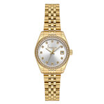 Браслет из нержавеющей стали с золотистым покрытием не только стильно смотрится, но и гарантирует долговечность и комфорт в носке. Длина браслета составляет 175 мм, а его ширина — 14 мм, что делает часы универсальными для большинства запястий. Модель также оснащена календарем, что добавляет функциональности в повседневное использование.