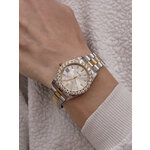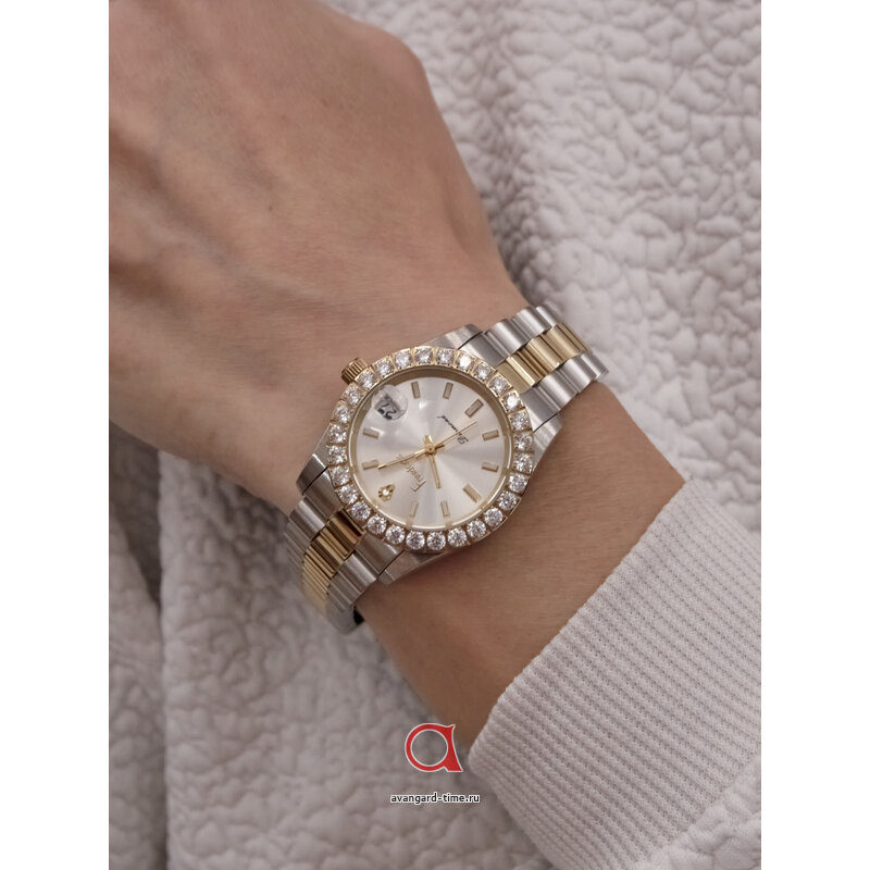 **Аналоговый способ отображения времени** гарантирует легкость восприятия, а стильный **круглый циферблат** серебристого цвета с изысканными **страйзами** придаёт вашему образу изысканности и шарма. Корпус из **нержавеющей стали** с эффектом хрома подчеркивает вашу индивидуальность и делает часы идеальным дополнением к любому стилю.