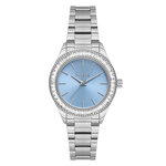 Корпус в хромированном цвете выполнен из нержавеющей стали, что обеспечивает долговечность и устойчивость к внешним воздействиям. Серебристый браслет из того же материала мягко обвивает запястье, добавляя изысканности вашему образу. Нежный голубой циферблат, украшенный сверкающими стразами, привлекает внимание и создает настроение легкости и романтики.