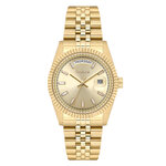 Круглая форма и роскошный золотистый цвет корпуса, выполненного из высококачественной нержавеющей стали, добавляют ещё больше шика. Золотистый браслет, также из нержавеющей стали, нежно обнимает запястье, а минеральное стекло защищает циферблат от повреждений, сохраняя его безупречный вид на длительное время.