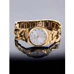 Корпус часов выполнен из нержавеющей стали и окрашен в роскошный золотистый цвет, что придаёт им эффектный и современный вид. Круглая форма циферблата, выполненного в серебристом цвете, создает контраст, который привлекает внимание и добавляет шарма. Уникальные отметки времени и изысканные стразы не только украшают часы, но и делают их практичными, позволяя легко считывать время в любых условиях.