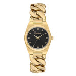 Корпус часов окрашен в золотистый цвет, выполнен из нержавеющей стали, что гарантирует долговечность и прочность изделия. Черный циферблат эффектно выделяется на фоне золотистой рамы, а стильные отметки вместо традиционных цифр подчеркивают современный дизайн. Данный аксессуар дополнен грациозными стразами, которые добавляют блеска и очарования, превращая часы в не просто функциональный предмет, но и яркий элемент вашего стиля.