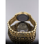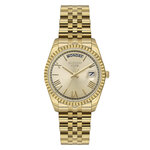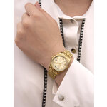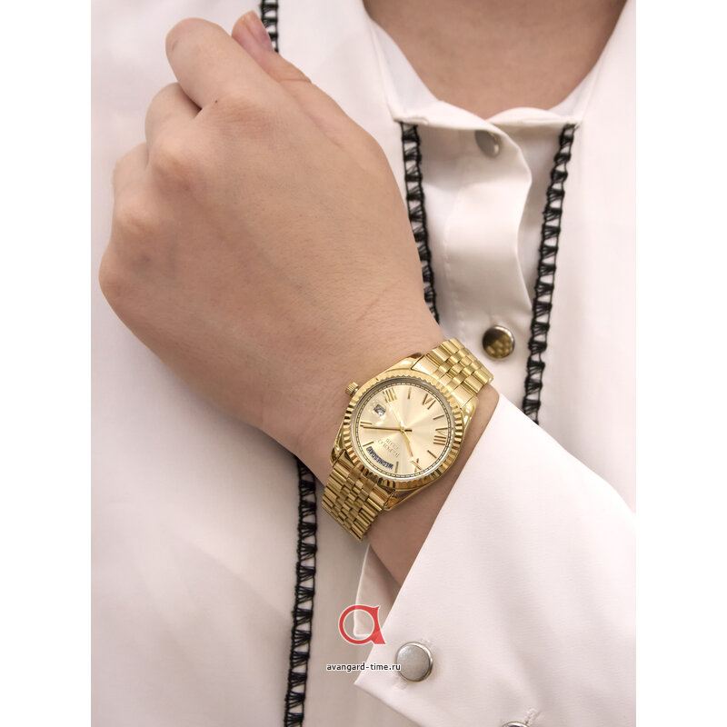 Часы имеют классический круглый циферблат золотистого цвета, который гармонично сочетается с золотистым корпусом из нержавеющей стали. Бордюр и браслет выполнены из того же материала, что гарантирует долговечность и утонченный внешний вид. С их шириной 18 мм и длиной ремешка 170 мм, они идеально подойдут для комфортной носки на запястье взрослой женщины.