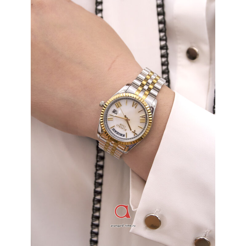 Корпус окружности строгого хромированного цвета выполнен из нержавеющей стали, обеспечивая прочность и долговечность. Перламутровый циферблат с комбинированной индикацией не только привлекает внимание, но и помогает легко считывать время. Элегантный браслет из нержавеющей стали в том же хромированном оттенке гармонично дополняет общий стиль изделия. Длина ремешка составляет 170 мм, а ширина - 18 мм, что обеспечивает комфортную посадку на запястье.
