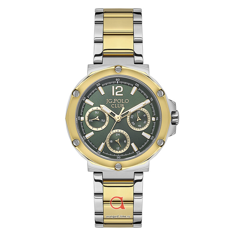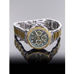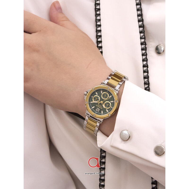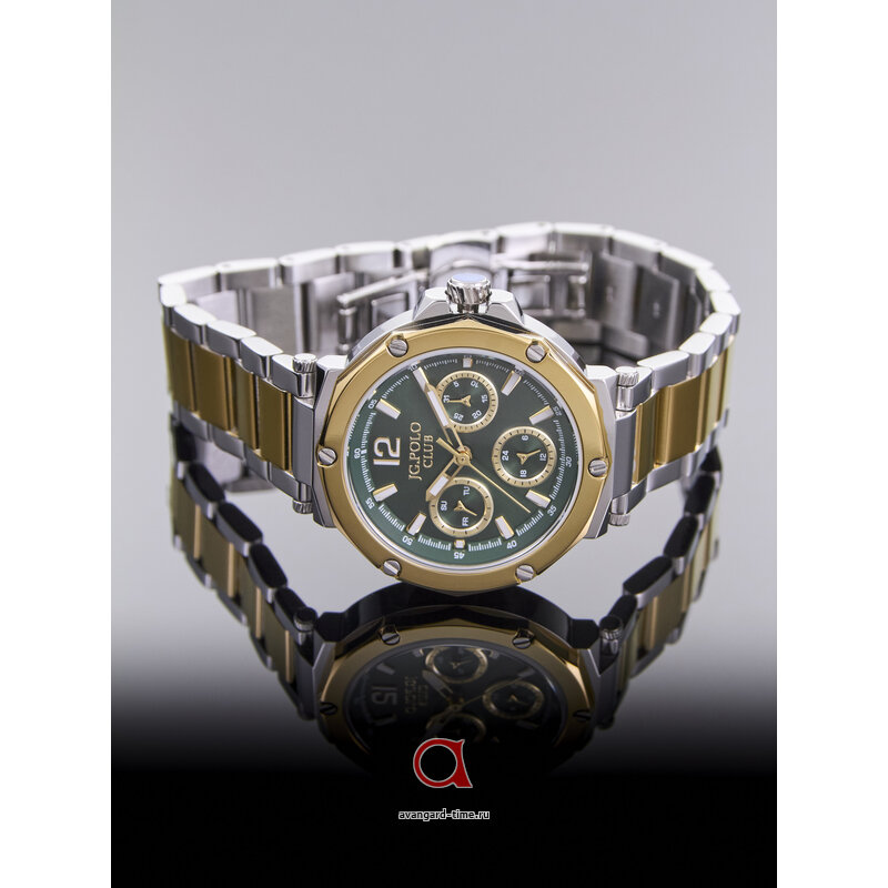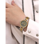 Корпус из качественной нержавеющей стали с хромированным покрытием придаёт изделию стильный вид, а золотистый браслет обеспечивает комфорт и долговечность. Зеленый циферблат оригинально выделяется на фоне металлических деталей и привносит небольшую изюминку в ваш повседневный стиль. Комбинированная индикация времени добавляет функциональности, а дополнительные действующие циферблаты делают часы еще более информативными.