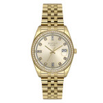Корпус часов выполнен из высококачественной нержавеющей стали с золотистым оттенком, который эффективно ловит свет и создает эффектный визуальный акцент. Округлая форма корпуса и циферблата, также выполненного в золотистом цвете, придают часам современный вид, который обязательно привлечет внимание окружающих. Стильные стразы, украшающие циферблат, добавляют изысканности и шика, превращая каждую деталь в произведение искусства.