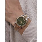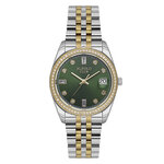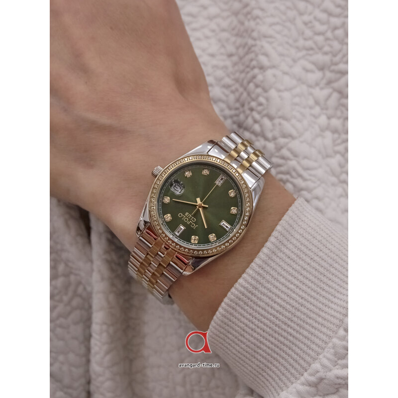 Циферблат выполнен в насыщенном зеленом цвете, а контрастные отметки делают считывание времени максимально удобным. Для создания дополнительного блеска используются стразы, которые добавляют нотку шикарности, позволяя вам выделиться в любой обстановке. Встроенный календарь позволит вам всегда быть в курсе текущей даты.