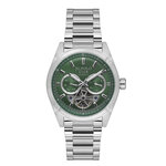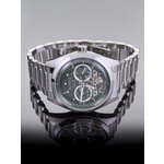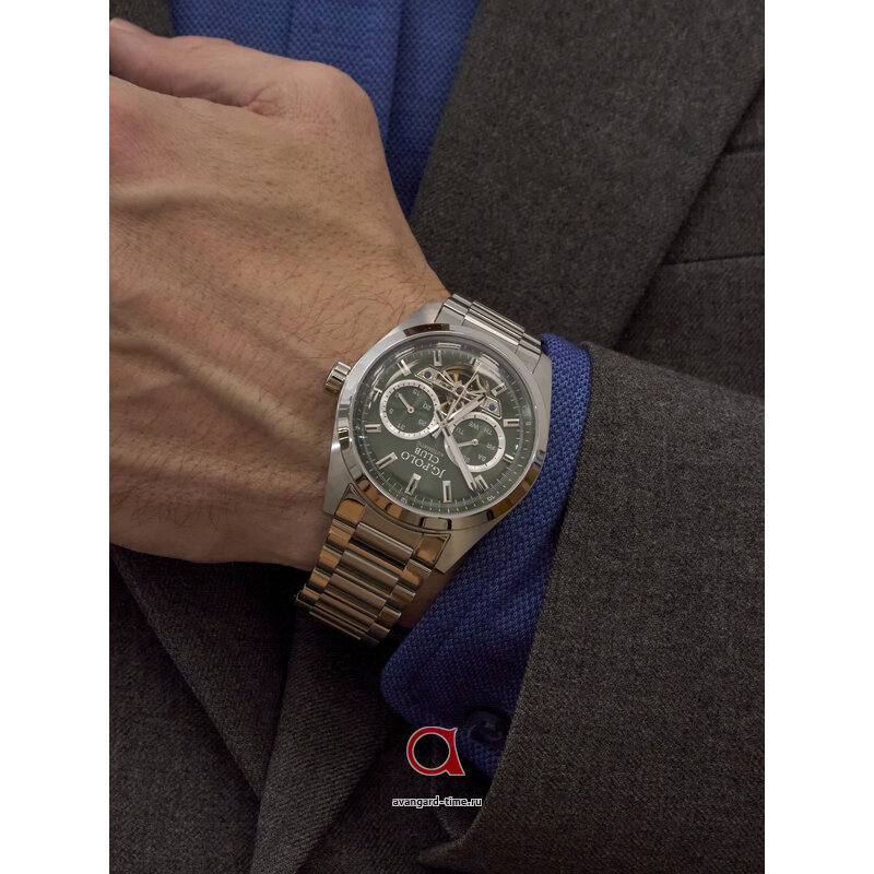 Классический круглый корпус, выполненный из хромированной нержавеющей стали, обеспечивает этому аксессуару прочность и стильный внешний вид. Зеленый циферблат с выразительными отметками и дополнительными циферблатами органично сочетается с хромированным браслетом, создавая гармоничный образ. Индикация времени осуществляется аналоговым способом, что придаёт часам особую изысканность.