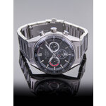 Часы обладают элегантным круглый корпусом из нержавеющей стали с хромированным покрытием, что придаёт им утончённый вид. Черный циферблат украшен четкими отметками и дополнительными действующими циферблатами, что позволяет легко отслеживать время, а встроенный календарь и функция второго часового пояса делают их ещё более функциональными.