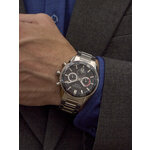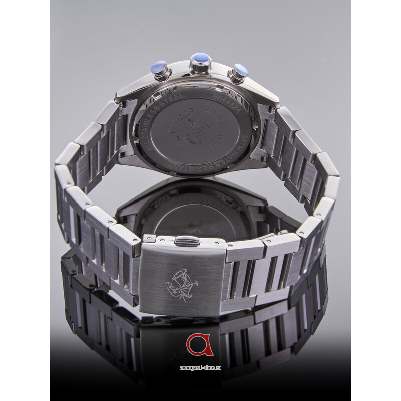 Длина ремешка составляет 180 мм, а ширина — 22 мм, что гарантирует комфортную посадку на запястье. Серебристый браслет из нержавеющей стали отлично сочетается с хромированным корпусом и придаёт часам мужественный и стильный облик. Для удобства в темноте предусмотрена подсветка, что позволяет без труда считывать время в любых условиях.