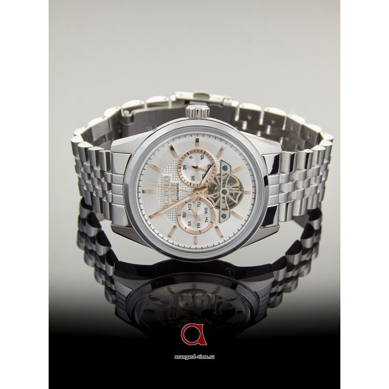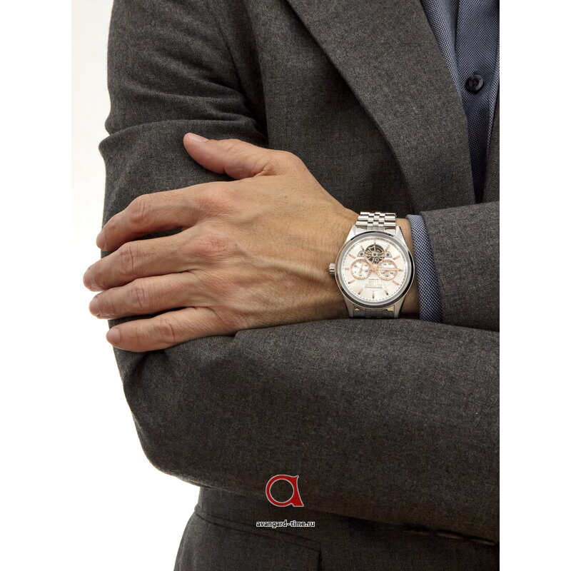 - **Циферблат**: Серебристый циферблат с отметками и дополнительными циферблатами создаёт стильный акцент.