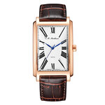 Часы имеют аналоговый способ отображения времени и оформлены в прямоугольной форме, что придаёт им оригинальность и элегантность. Корпус выполнен из высококачественной латуни с покрытием из розового золота, придающим изделию роскошный вид, а белый циферблат с римскими цифрами добавляет нотки традиционного стиля. Такой контраст делает часы легко читаемыми и стильными.