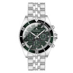 Часы выполнены в круглом корпусе из нержавеющей стали с хромированным покрытием, что обеспечивает не только современный внешний вид, но и прочность. Серебристый браслет гармонично сочетается с зеленым циферблатом, на котором расположены удобные отметки для глаз, позволяющие легко считывать время. Дополнительные циферблаты добавляют функциональности, подчеркивая высокое качество исполнения.