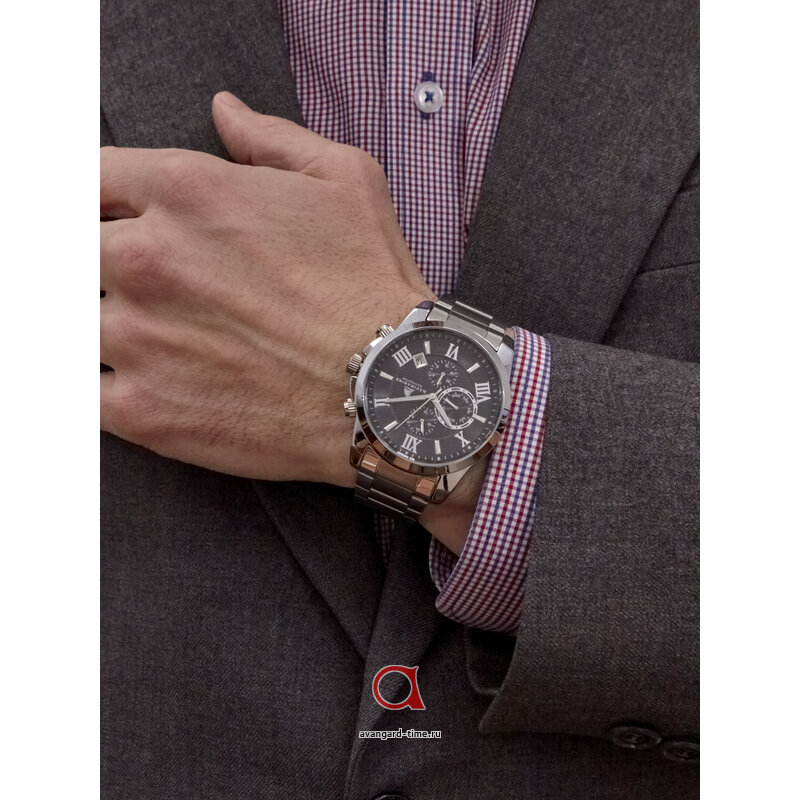 Часы имеют элегантный круглый корпус из легкого и прочного сплава, выполненный в изысканном хромированном цвете. Черный циферблат с комбинированной индикацией не только привлекает взгляд, но и позволяет легко считывать время. Дополнительные действующие циферблаты добавляют функциональности, а встроенный календарь и второй часовой пояс делают эти часы незаменимыми для часто путешествующих.