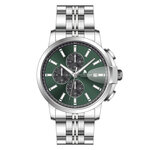 Часы выполнены в строгом круглом корпусе хромового цвета, который подчеркивает их элегантный дизайн. Нержавеющая сталь, из которой изготовлен ремешок, гарантирует долговечность и комфорт при носке. Зеленый циферблат с отметками делает время четко читаемым, а дополнительные действующие циферблаты добавляют функциональности, позволяя следить за несколькими параметрами одновременно.