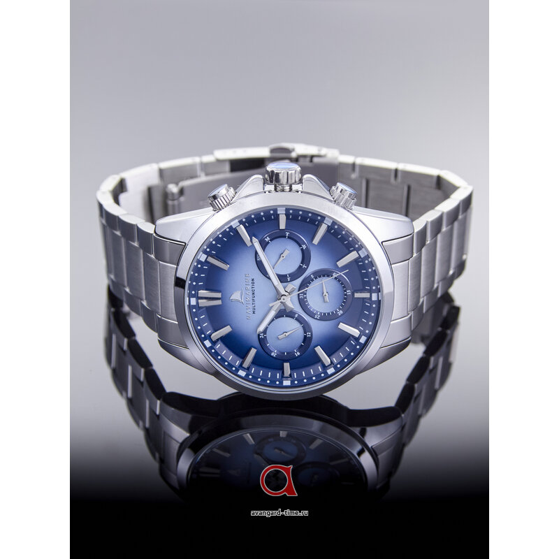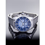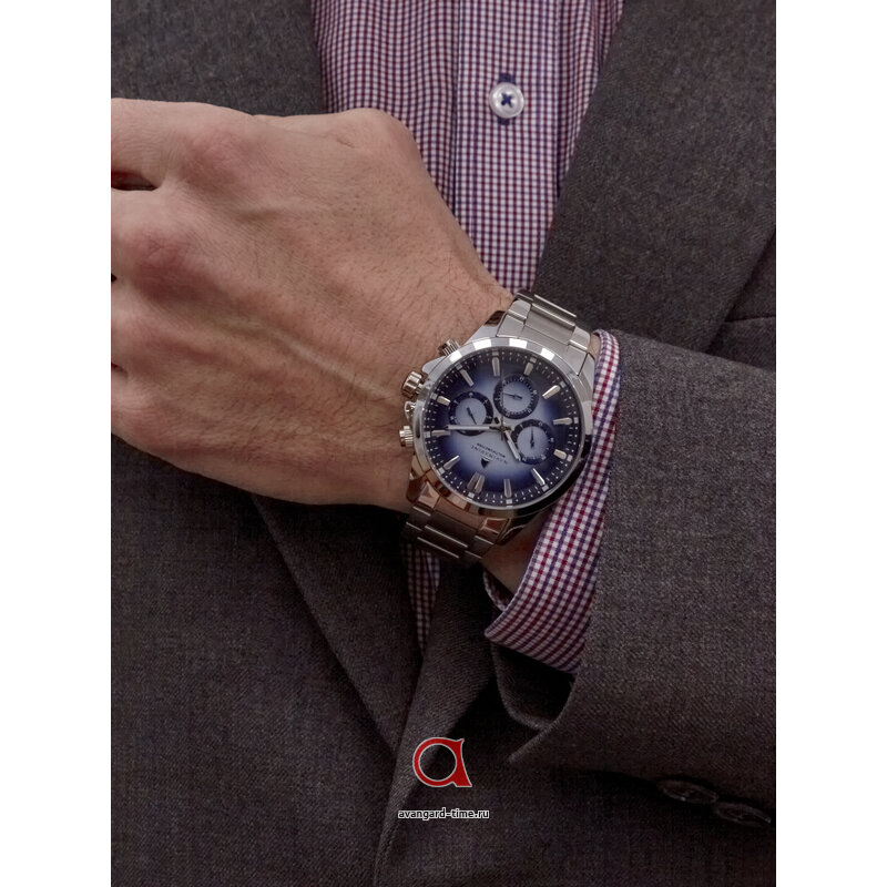 Способ отображения времени — аналоговый, что придает часам традиционный шарм. Яркий синий циферблат, обрамленный хромированным корпусом из легкого сплава, притягивает взгляд и отлично смотрится в любом окружении. Дополнительные циферблаты добавляют функциональности, а отметки на главной шкале позволяют легко считывать время.
