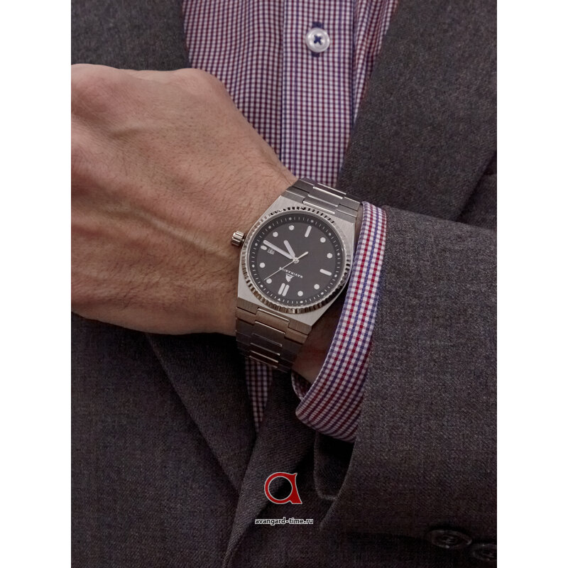 Время на циферблате отображается в аналоговом формате с чёткими отметками, что позволяет легко считывать часы даже в условиях низкой освещенности благодаря встроенной подсветке. Стильный черный циферблат эффектно контрастирует с серебристым корпусом и браслетом из нержавеющей стали, подчеркивая их премиальный вид. Круглая форма корпуса делает эту модель универсальной — она отлично дополнит как повседневный, так и деловой стиль.