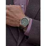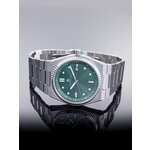 Корпус часов выполнен из нержавеющей стали с элегантным серебристым покрытием, которое отлично дополняет зеленый циферблат с отметками, придавая изделию стильный и запоминающийся внешний вид. Благодаря круглой форме и комплекту из прочного нержавеющего сталевого ремешка, ширина которого составляет 26 мм, часы обеспечивают не только комфорт в носке, но и долговечность.