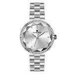 Корпус часов выполнен из хромированного металла, что подчеркивает их утонченный дизайн, а серебристый ремешок из нержавеющей стали добавляет нотку роскоши и прочности. Циферблат, выполненный в нежном серебристом цвете, украшен стильными отметками и изысканными стразами, которые блестят при каждом движении, придавая образу особую яркость.