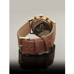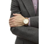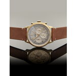 Часы имеют аналоговое отображение времени, обеспечивая лёгкость восприятия и в то же время атмосферу утончённого стиля. Классическая круглая форма и золотистый корпус из нержавеющей стали подчеркивают роскошь и престиж, а серебристый циферблат с отметками и действующими дополнительными циферблатами создаёт гармоничное сочетание элегантности и практичности.