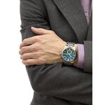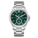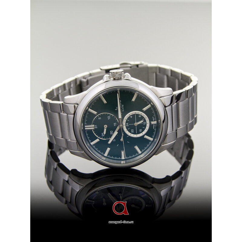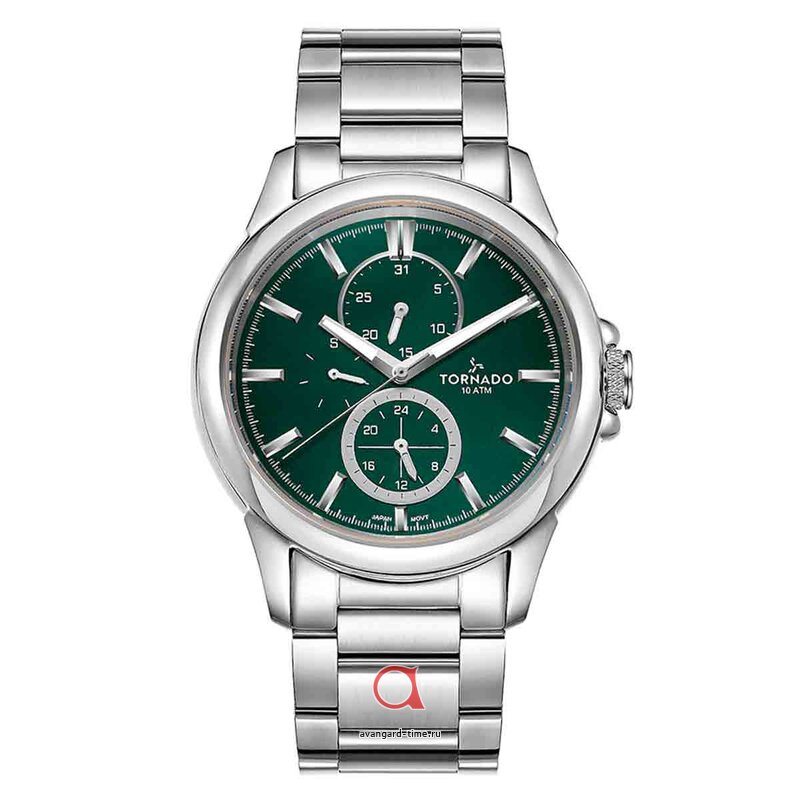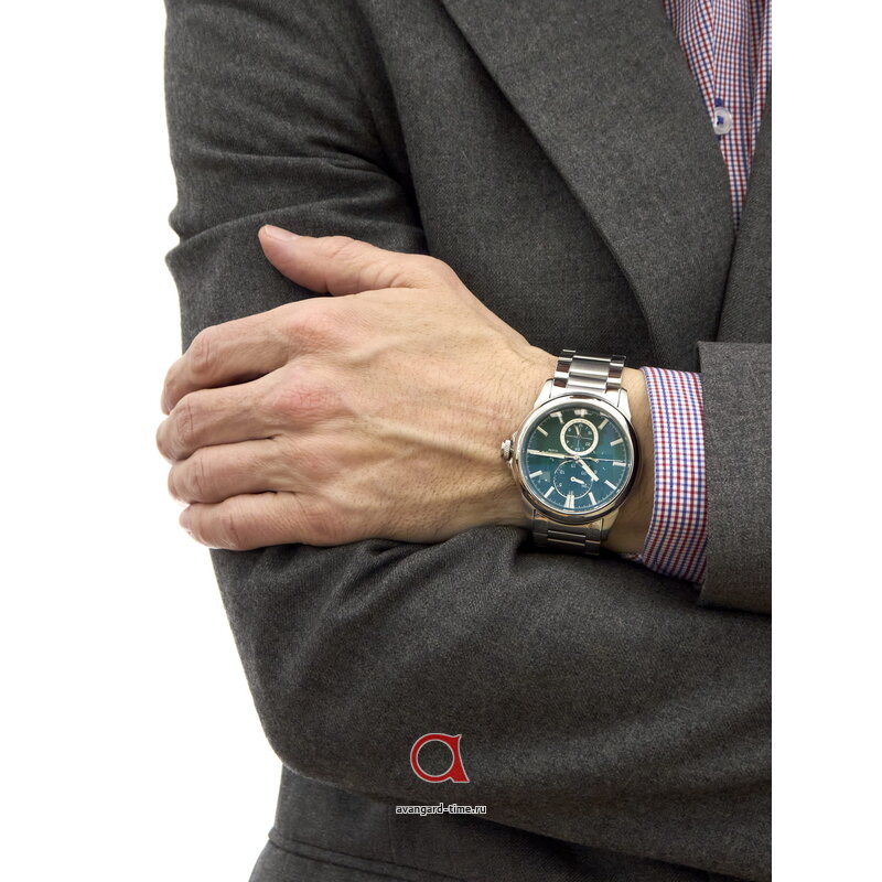 Способ отображения времени выполнен в аналоговом формате, что придаёт часам элегантный вид. Зеленый циферблат, создает эффектный контраст с хромированным корпусом, выполненным из нержавеющей стали, что делает изделие универсальным для различных случаев — от деловых встреч до вечерних выходов. С дополнительными действующими циферблатами и отметками вы всегда будете в курсе времени.