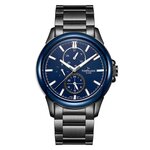 С помощью классического аналогового отображения времени, выполненного на роскошном синем циферблате с действующими дополнительными циферблатами, вы всегда будете в курсе текущего времени. Часы имеют круглую форму и черный корпус, выполненный из высококачественной нержавеющей стали, что обеспечивает им прочность и долговечность. Черный ремешок из того же материала нежно обвивает запястье, обеспечивая комфорт при носке.