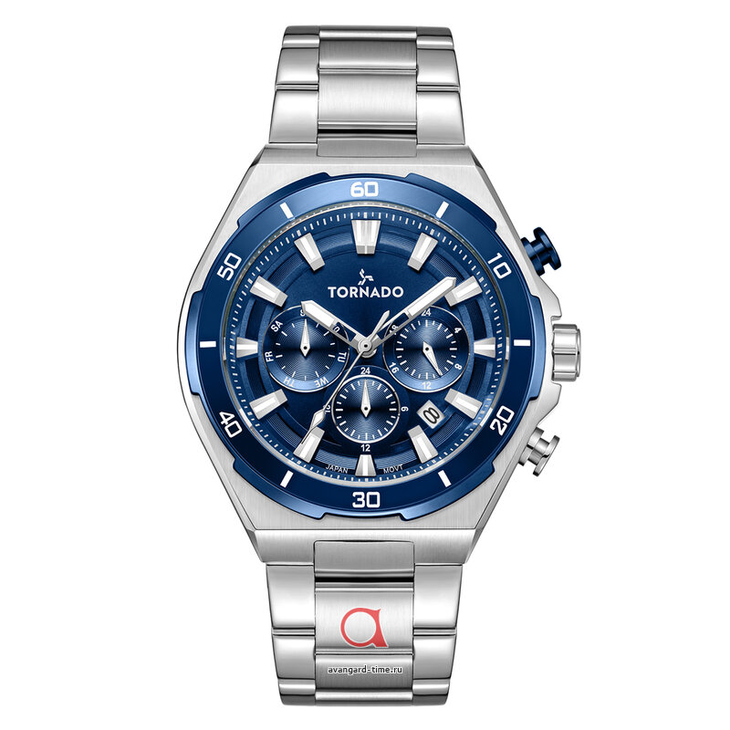 Корпус часов выполнен из нержавеющей стали с хромированным покрытием, что обеспечивает не только прочность, но и стильный внешний вид. Серебристый браслет из нержавеющей стали добавляет яркости образу, а минеральное стекло с сапфировым покрытием защищает циферблат от повреждений. Синий цвет циферблата делает часы еще более привлекательными, акцентируя внимание на отполированных отметках времени и дополнительных цифербатах.