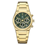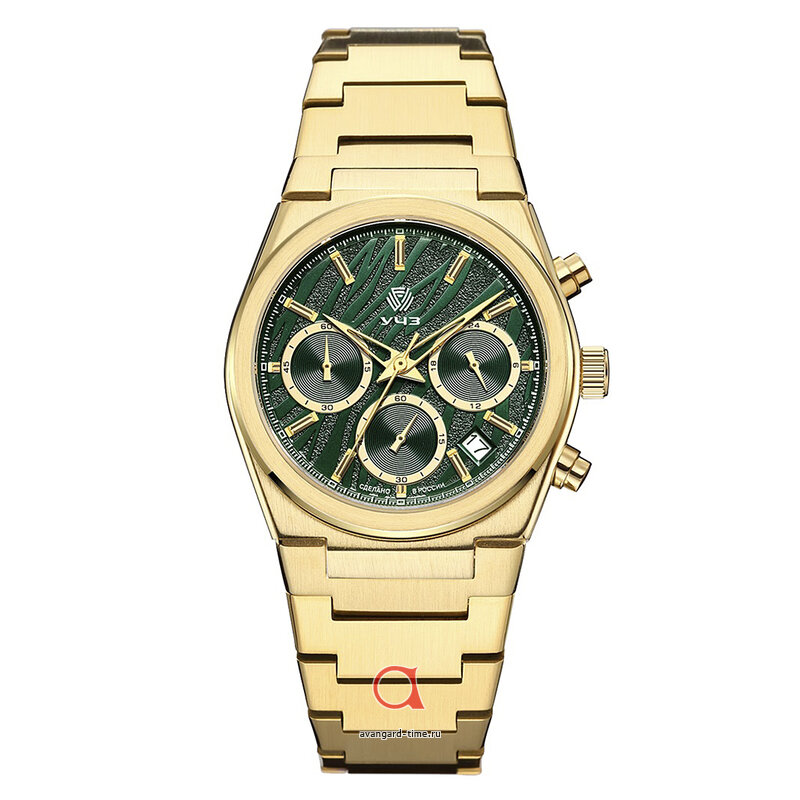 Корпус часов выполнен из нержавеющей стали с изысканным золотистым оттенком, который придаст вашему запястью роскошный вид. Зеленый циферблат создает стильный контраст и привлекает внимание, а отметки на циферблате обеспечивают легкость восприятия времени. Дополнительные действующие циферблаты и встроенный хронограф делают эти часы не только красивыми, но и практичными, позволяя вам точно отслеживать время и выполнять множество задач в повседневной жизни.