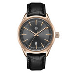 Часы имеют аналоговое отображение времени с четкими отметками, что делает их функциональными и удобными в использовании. Круглая форма корпуса выполнена из нержавеющей стали и окрашена в изящный цвет розового золота, придавая им роскошный вид. Темно-серый циферблат подчеркнет вашу индивидуальность и стиль, а черный кожаный ремешок добавит нотку утонченности.