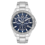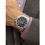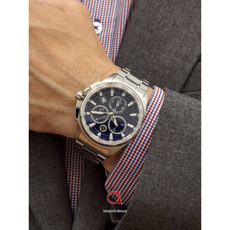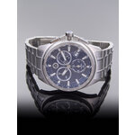 Корпус, выполненный из нержавеющей стали в хромированном цвете, сочетает в себе надёжность и современный дизайн. Уникальный синий циферблат с отметками и действующими дополнительными циферблатами придаёт этому аксессуару неповторимый шарм. Хронограф, встроенный в часы, добавляет функциональности и делает их отличным выбором для активных мужчин, следящих за временем.