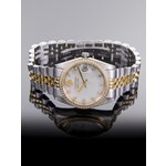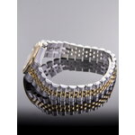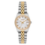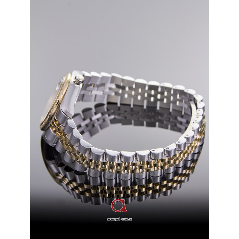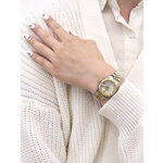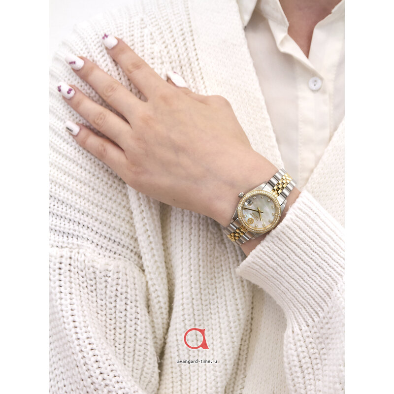 Изящный круглый корпус хромового цвета с перламутровым циферблатом украшен стразами, добавляя бриллиантовый блеск. Нержавеющая сталь используется как материал как корпуса, так и браслета, что гарантирует долговечность и надежность изделия.