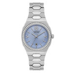 Корпус часов выполнен из нержавеющей стали с хромированным покрытием, придающим им сияющий вид, а сапфировое стекло обеспечивает надежную защиту циферблата от царапин и повреждений. Необычный голубой циферблат с индикацией в виде отметок и эффектными стразами подчеркивает утонченность этого аксессуара и привлекает внимание.