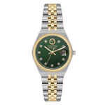 С устройством аналогового отображения времени, эти кварцевые часы обеспечат вам точность и надежность, благодаря механизму EPSON VX12. Их хромированный корпус и браслет из нержавеющей стали придают модели элегантный и современный вид, а зеленый циферблат, украшенный стразами, добавляет нотку роскоши и оригинальности.