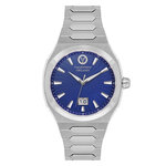 Круглая форма циферблата, выполненная в глубоких синих тонах, гармонично сочетается с серебристым браслетом и корпусом, созданными из нержавеющей стали. Этот материал не только придаёт часам стильный вид, но и обеспечивает долговечность и износостойкость. Удобный и прочный ремешок гарантирует комфорт при ношении в течение всего дня, будь то рабочая встреча или вечерний выход.