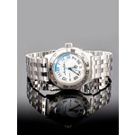 Классический круглый корпус из нержавеющей стали в хромированном цвете придает часам строгий и элегантный вид, а белый циферблат с арабскими цифрами обеспечивает отличную читаемость. Благодаря противоударной конструкции и водонепроницаемости до 20 Bar, вы можете быть уверены в их надежности в любых условиях.