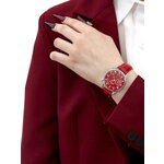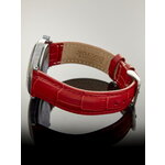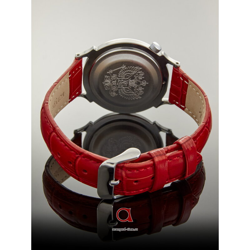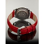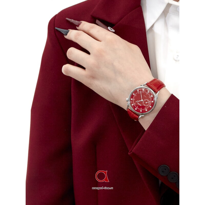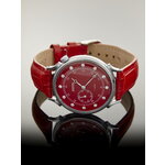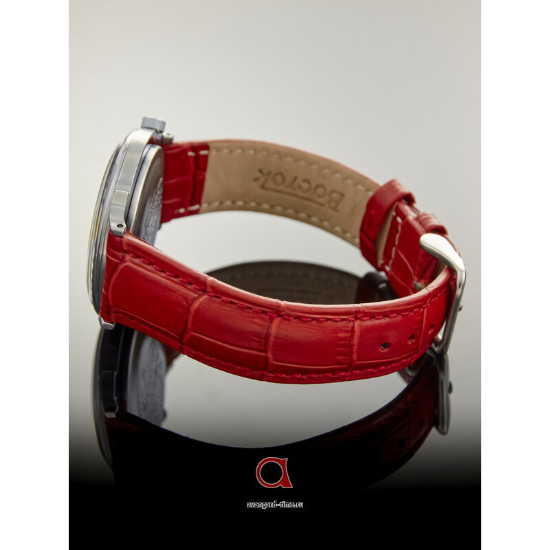 Кожаный ремешок красного цвета длиной 195 мм и шириной 18 мм обеспечивает комфортную посадку на запястье, а пружинный механизм гарантирует надежность и долговечность. Часы обладают классом водонепроницаемости 3 Bar, что позволяет вам не переживать о случайных брызгах и каплях.