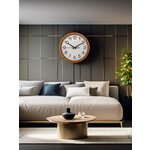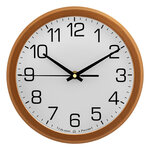 Эти настенные часы имеют красивую круглую форму и коричневый пластиковый корпус, который гармонично впишется в любой стиль помещения. Белый циферблат с арабскими цифрами делает время легко читаемым.