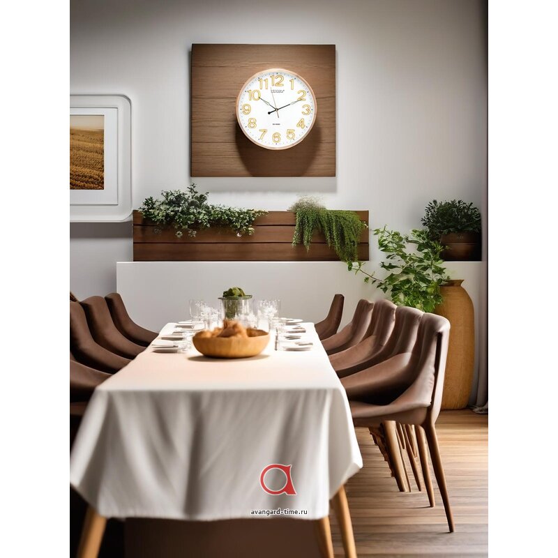 Часы выполнены в классическом стиле с округлой формой и изысканным корпусом цвета розового золота. Они прекрасно впишутся в любой интерьер, будь то кухня, гостиная, спальня или коридор. Белый циферблат, на котором четко и ясно представлены арабские цифры, обеспечивает отличную читаемость времени в любое время суток.