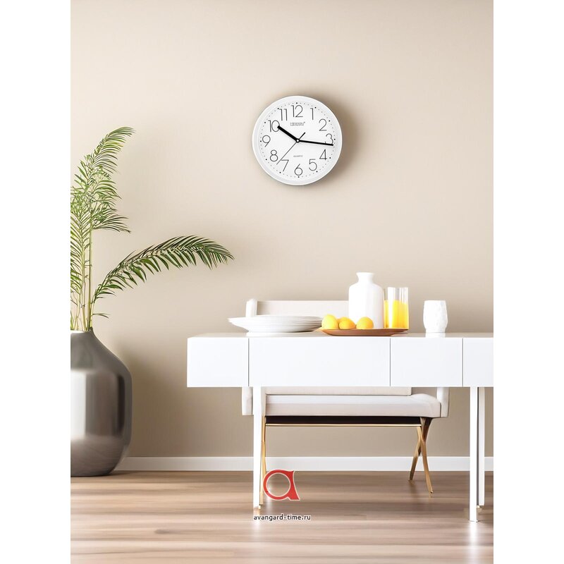 Эти круглые часы с белым корпусом и циферблатом великолепно впишутся в любое помещение – будь то кухня, гостиная, спальня или коридор. Индикация времени осуществляется арабскими цифрами, обеспечивая удобство использования для взрослой аудитории.