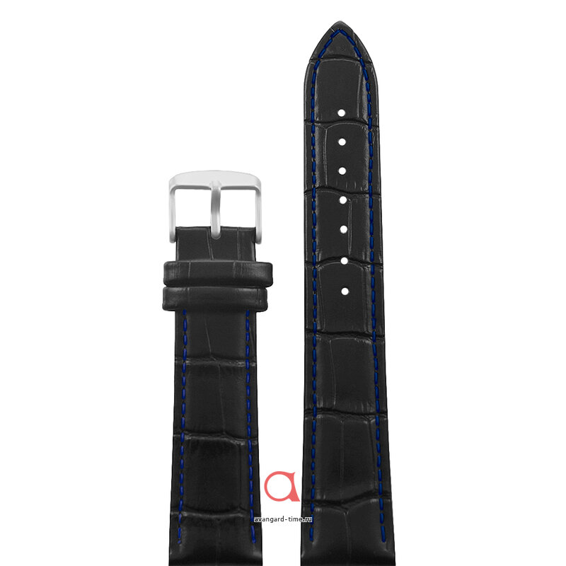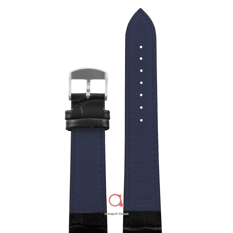 Ремешок шириной 20 мм выполнен из высококачественной натуральной кожи, что гарантирует не только долговечность, но и комфорт при ношении. Элегантный черный цвет основного материала дополняется стильными синими акцентами, создавая впечатляющий контраст, который подчеркивает вашу индивидуальность и вкус.
